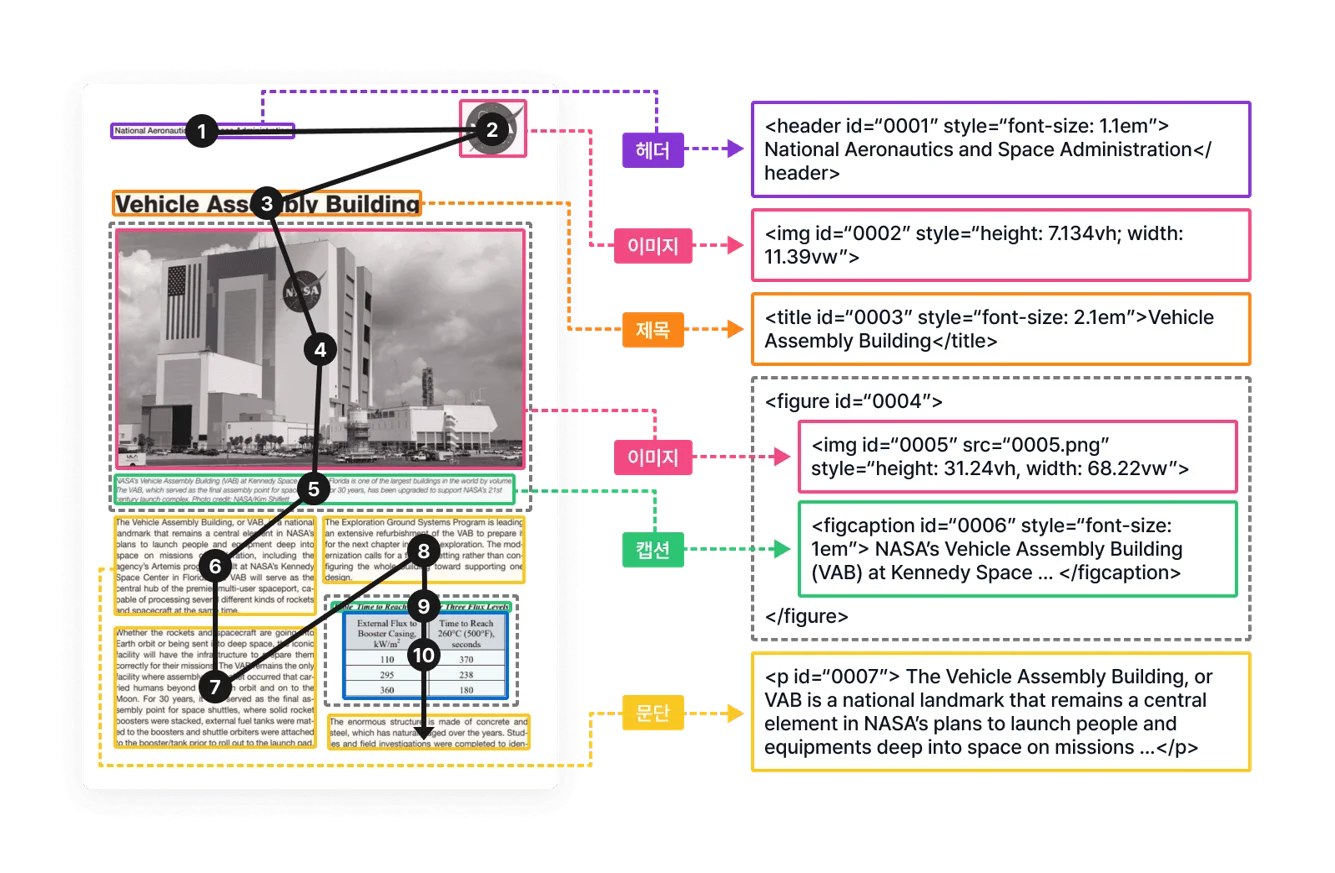 <table>,<thead>,<th>,<td>등)를 사용하여 표 구조를 표현합니다. 표 캡션을 인식하여<caption>태그로 표현하는 것도 가능합니다.자연스러운 읽기 순서 유지: 다양한 텍스트 객체들의 자연스러운 읽기 순서 인식을 유지하며 정보를 추출합니다.