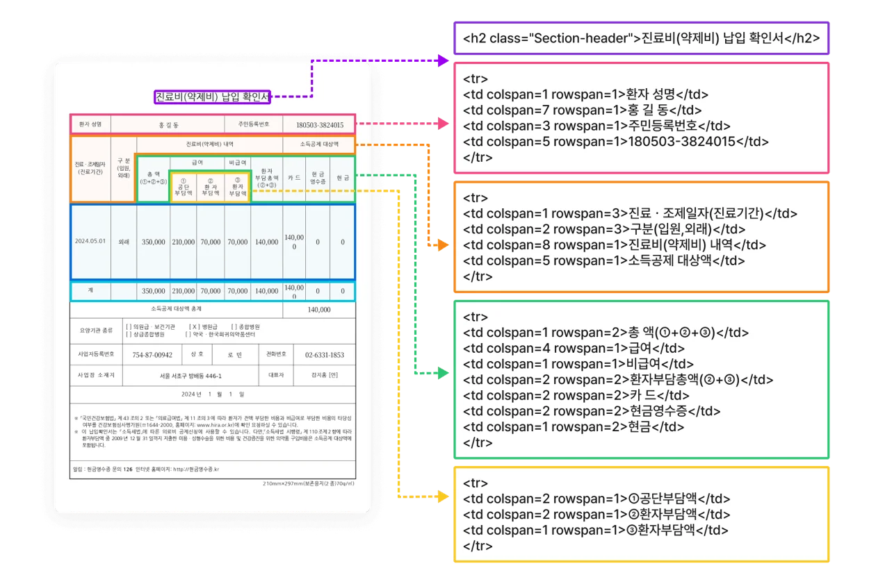 강력한 표 구조 인식: 문서 내 다양한 표 인식은 물론, 병합된 셀 인식 및 헤더 정보 인식도 가능합니다. HTML에서 테이블을 표현하는 태그(