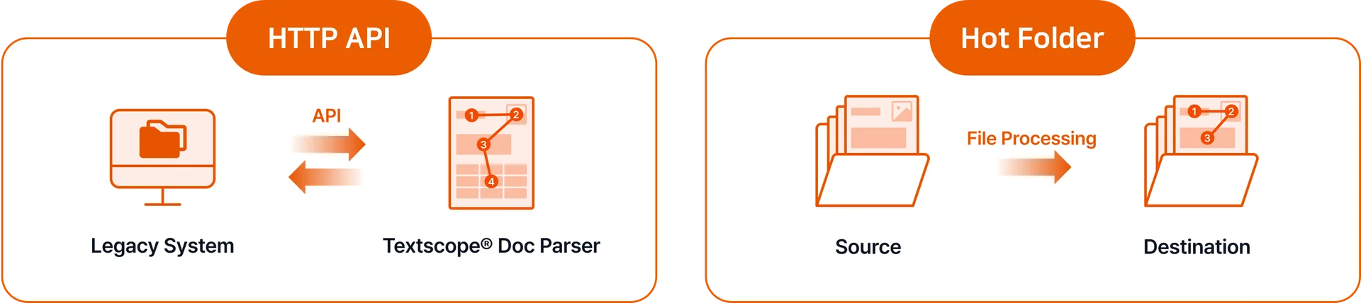 Hot Folder: 지정된 Source 폴더에서 파일을 주기적으로 식별하고 순차적으로 처리하며, 결과물을 Destination 폴더에 저장하는 방식으로 별도의 개발 없이 파일 시스템에 기반한 연동이 가능합니다. 에러가 발생한 파일은 별도의 경로에 저장됩니다.